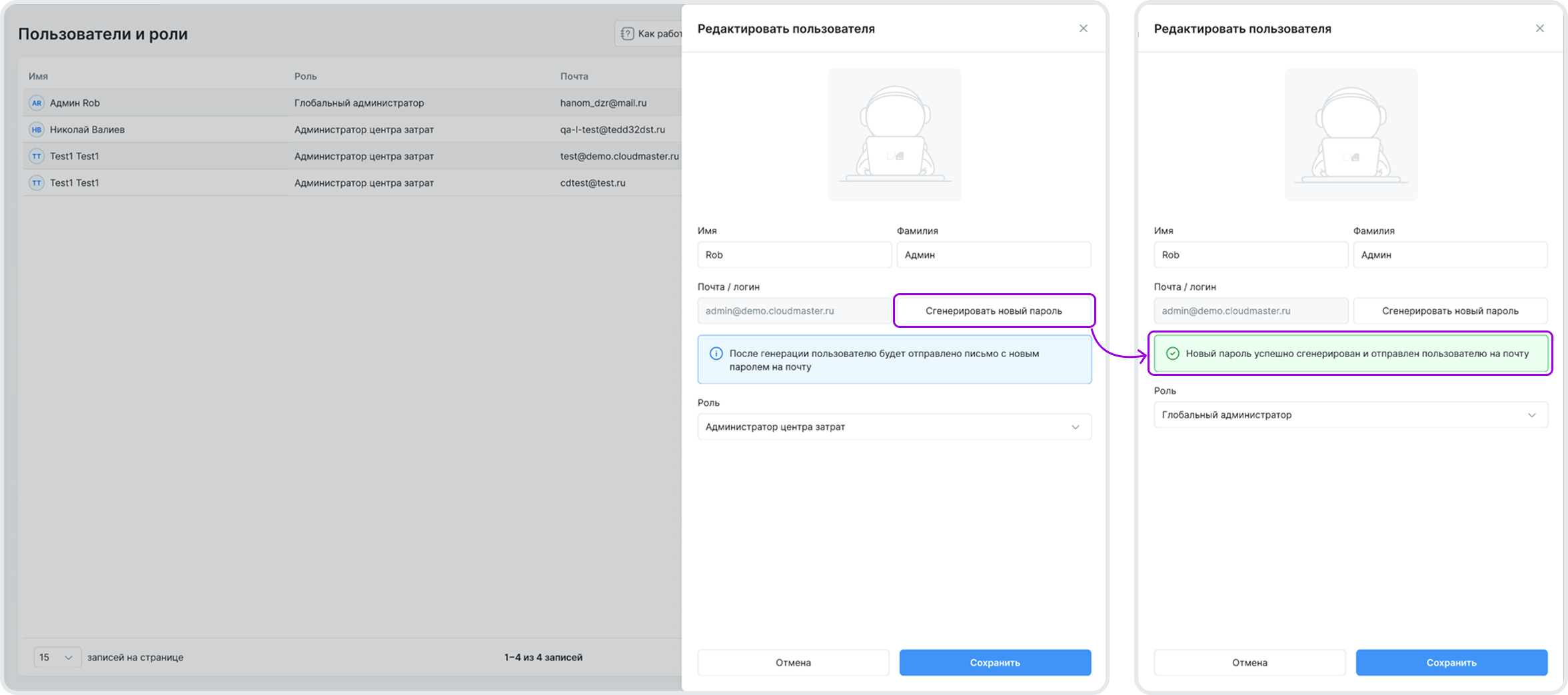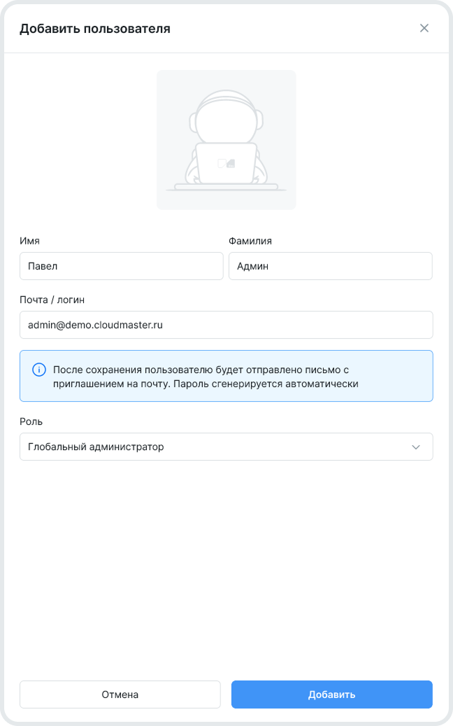 Система направит новому пользователю на почту письмо с временным паролем для доступа к платформе Cloudmaster.