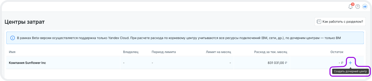 Дочерний центр — единица управления затратами на облачную инфраструктуру внутри корневого центра затрат. Дочерних центров может быть несколько.