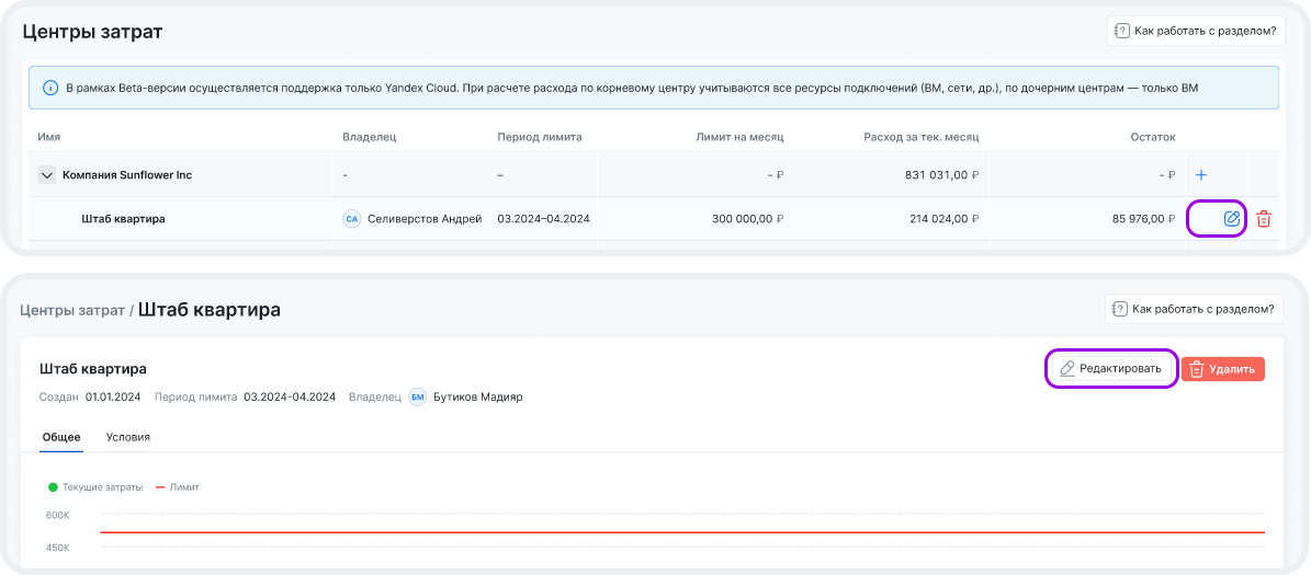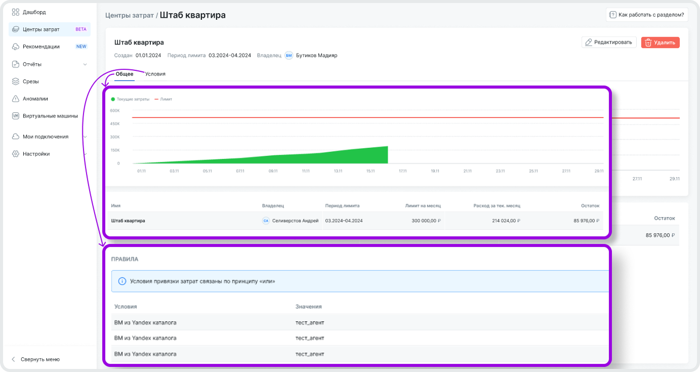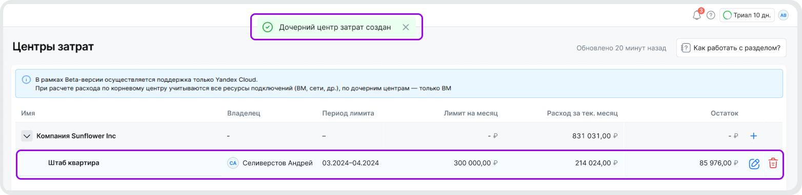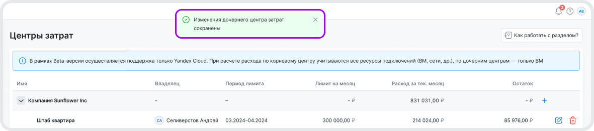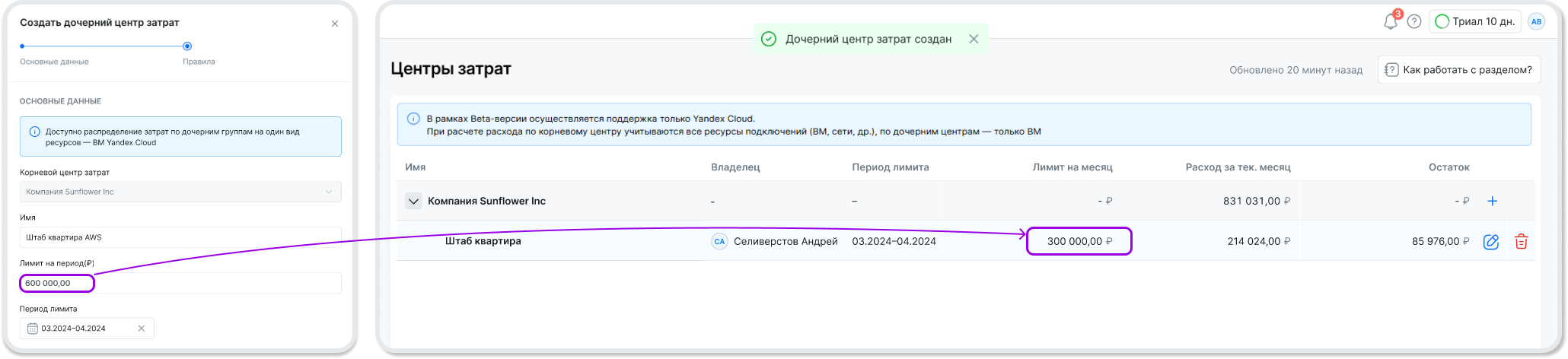 дочернего центравы указали, что Лимит на период (где период 2 мес.) = 600 000 руб.После создания центра Cloudmaster в разделе Центры затрат укажет, что Лимит на месяц