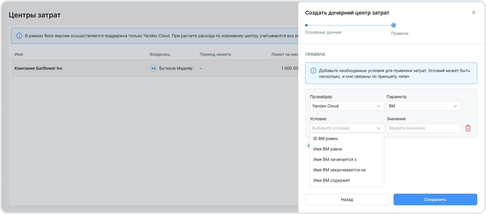 дочернего центрасвязаны по принципу «или». Например, еслиВМподходит по условию 1 и условию 2, затраты на неё будут учитываться только по одному условию вдочернем центре. -