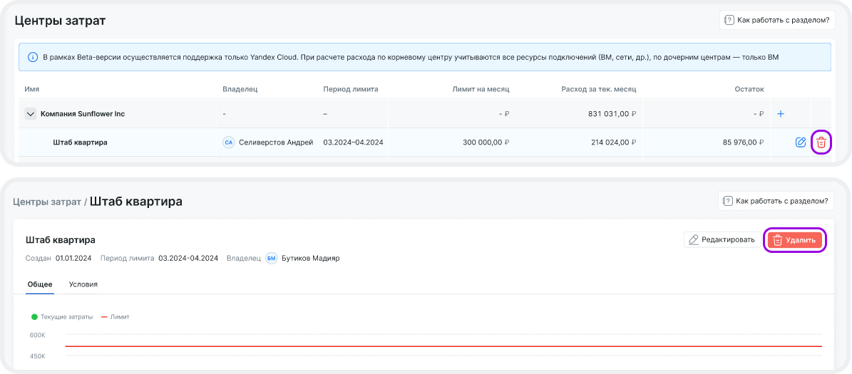 дочернего центраCloudmaster удалит строку с центром в разделе Центры затрат.Важно