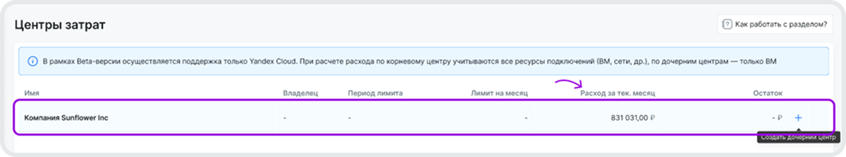 дочернему центру.Расчёт значений в полях Лимит на месяц, Расход за тек. период и Остаток может занять время, т.к. система собирает данные по вашей инфраструктуре не мгновенно после создания