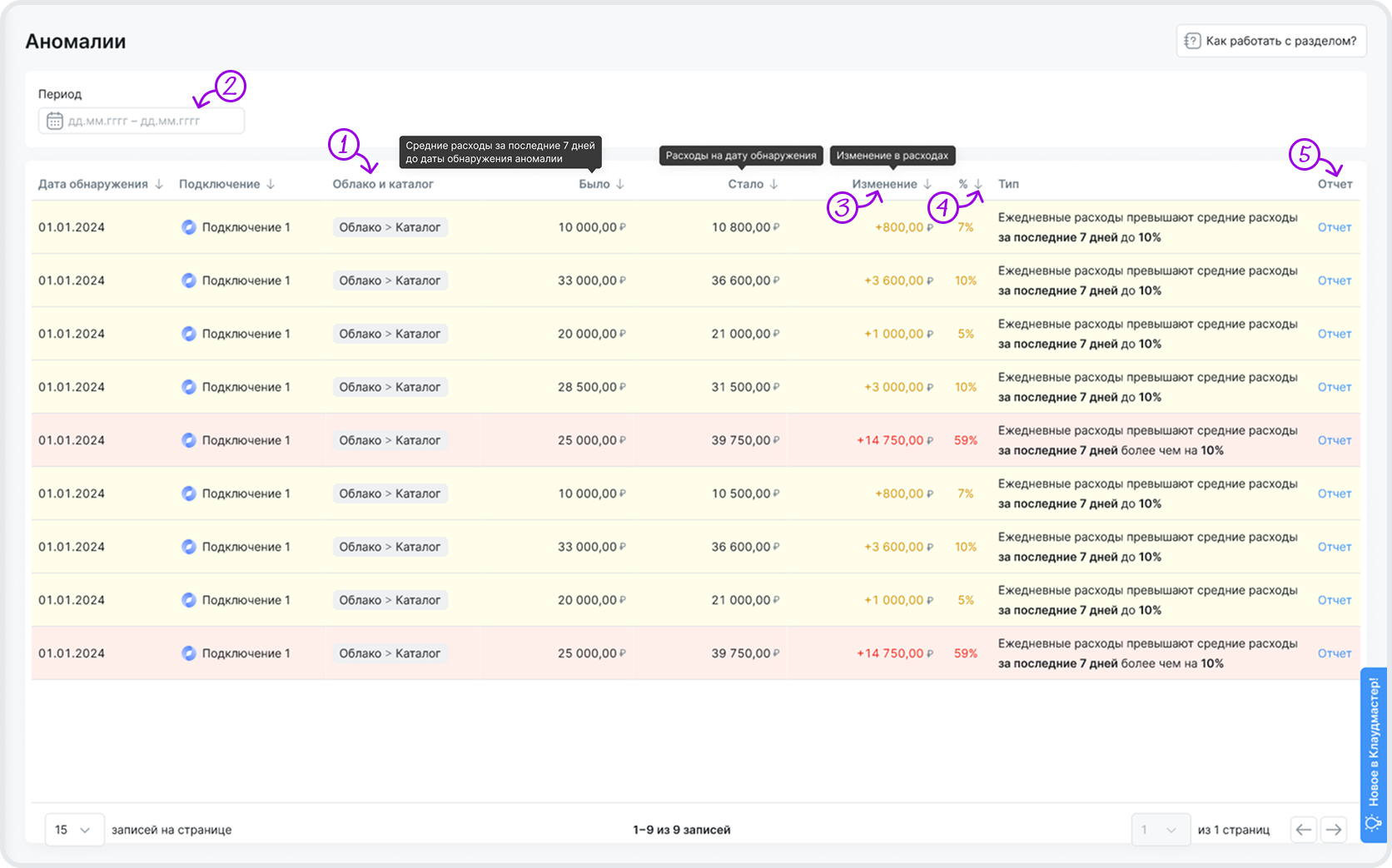 Аномалии отображаются в денежном эквиваленте (т.е. пользователи могут понять, на какую сумму аномально выросли затраты по сравнению со средним показателем за 7 дней до обнаружения отклонения).