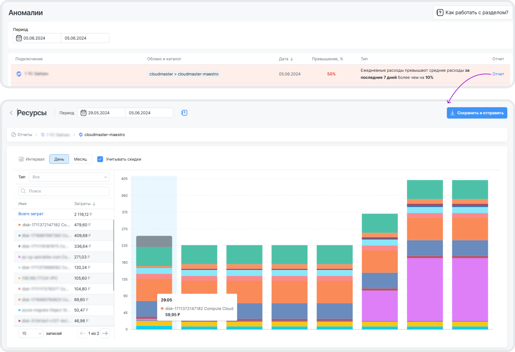 Например, аномалия была обнаружена 07.06.2024, т.к. Cloudmaster сравнил расходы с предыдущими 7 днями (30.04–06.06.2024) и зафиксировал их превышение. Cloudmaster отобразит аномалию 08.06.2024.