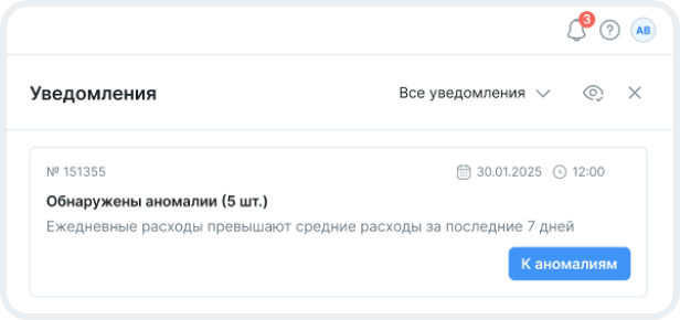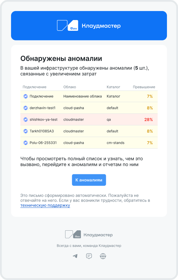 Если в одном или нескольких подключениях Yandex Cloud появляются аномальные отклонения по затратам, система направляет: