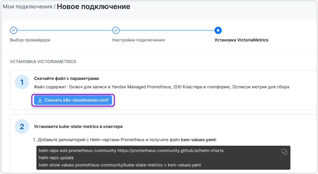 После ознакомления с инструкцией кликните на Скачать k8s-cloudmaster.conf, чтобы получить файл с параметрами кластера.
