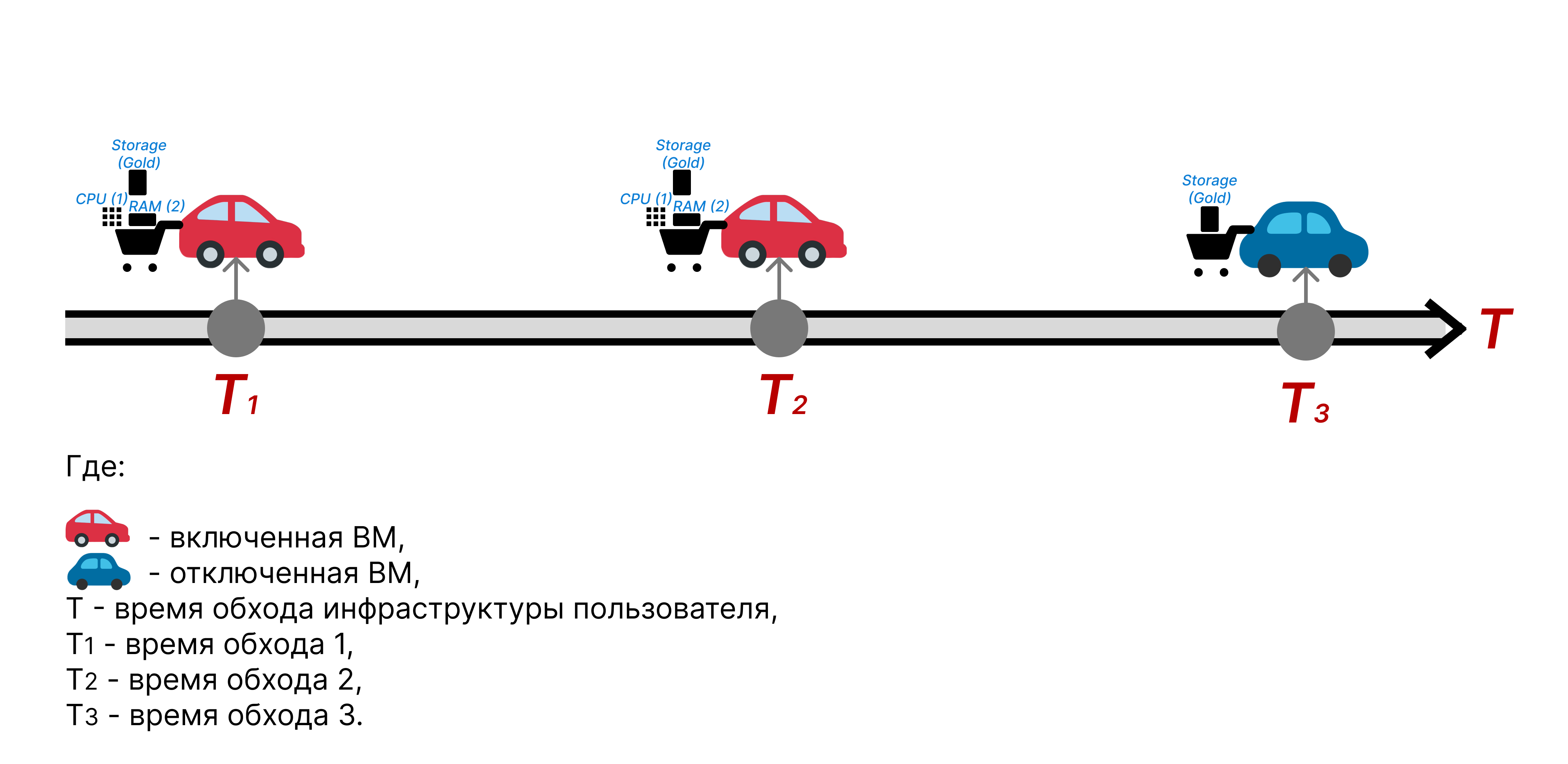 - на момент T2 обхода инфраструктуры Cloudmaster рассчитывает стоимость утилизации ВМ так: