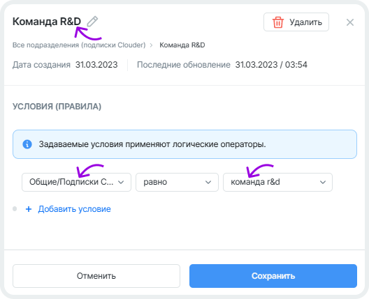 облаковCloudmaster и индивидуальные условия (см. категории и типы условий здесь).В нашем примере к Команде R&D относится подписка команда r&d. Нажмите на кнопку Сохранить.