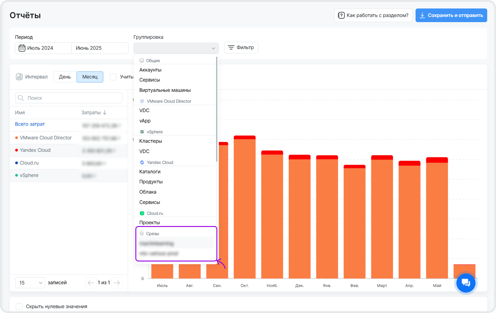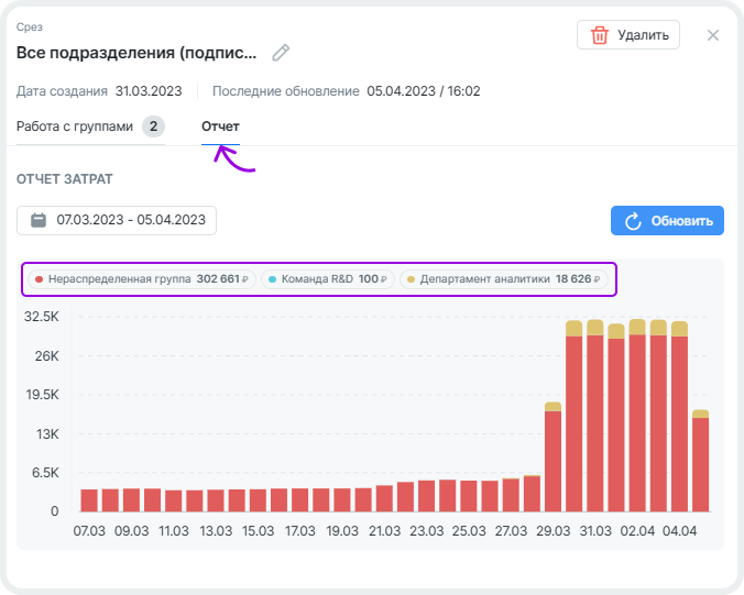 срезыстановятся доступны в меню Группировки на странице Отчеты.Таким образом, данные по срезам можно будет анализировать в динамике, в том числе в табличном отображении.