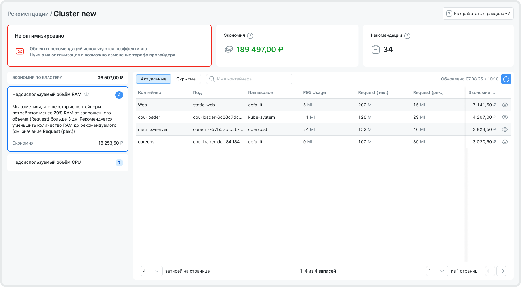 Информация, представленная в разделе позволяет оценить возможную выгоду от оптимизации запросов контейнеров на основные ресурсы: