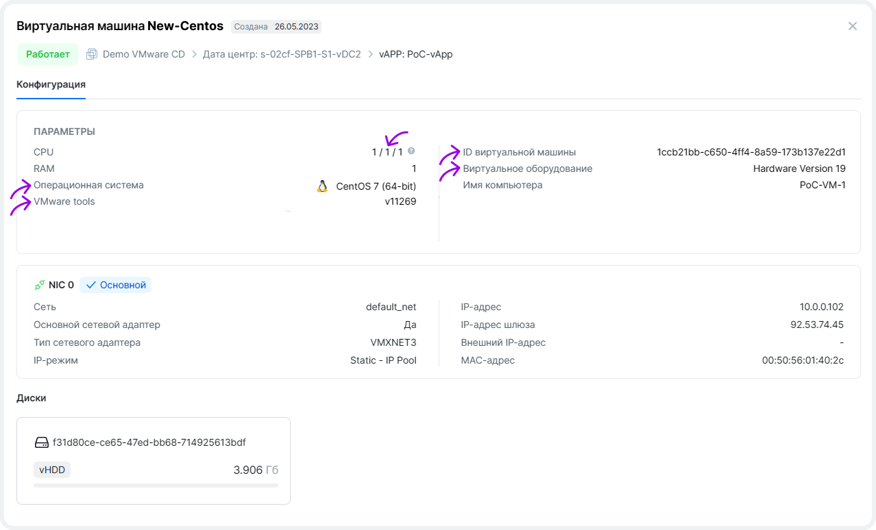 В карточке ВМ вкладке Конфигурация есть нативные параметры, которые Cloudmaster получает из VMware Cloud Director штатными средствами VMware.