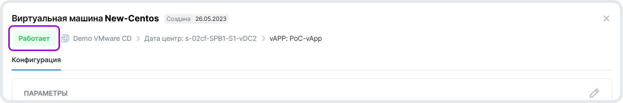 В левом верхнем углу карточки вы увидите текущий статус ВМ.