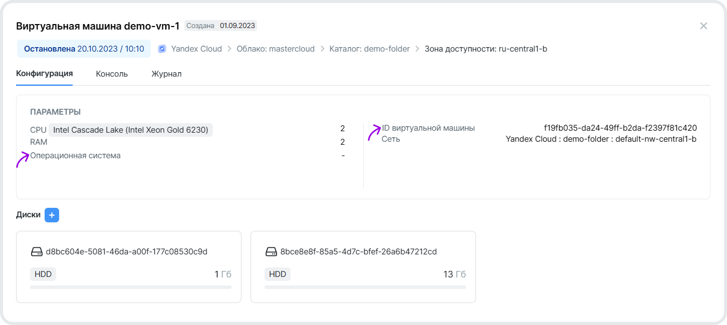В карточке ВМ вкладке Конфигурация есть нативные параметры, которые Cloudmaster получает
