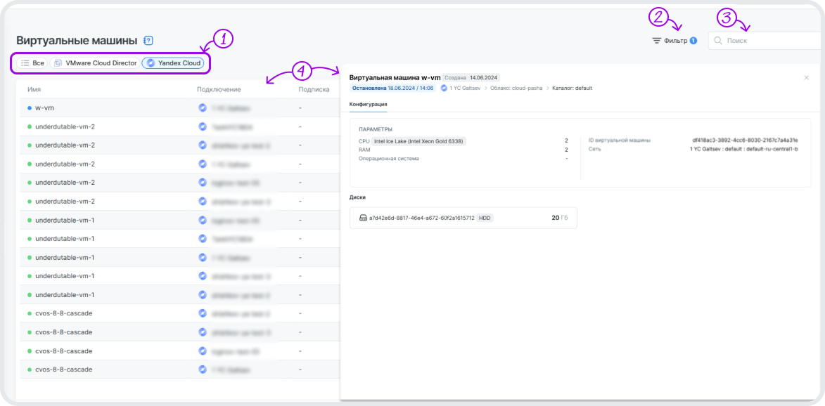 ВМподключенийVMware Cloud Director или Yandex Cloud отобразятся после того, как вы выберете карточкуподключениянад таблицей. -