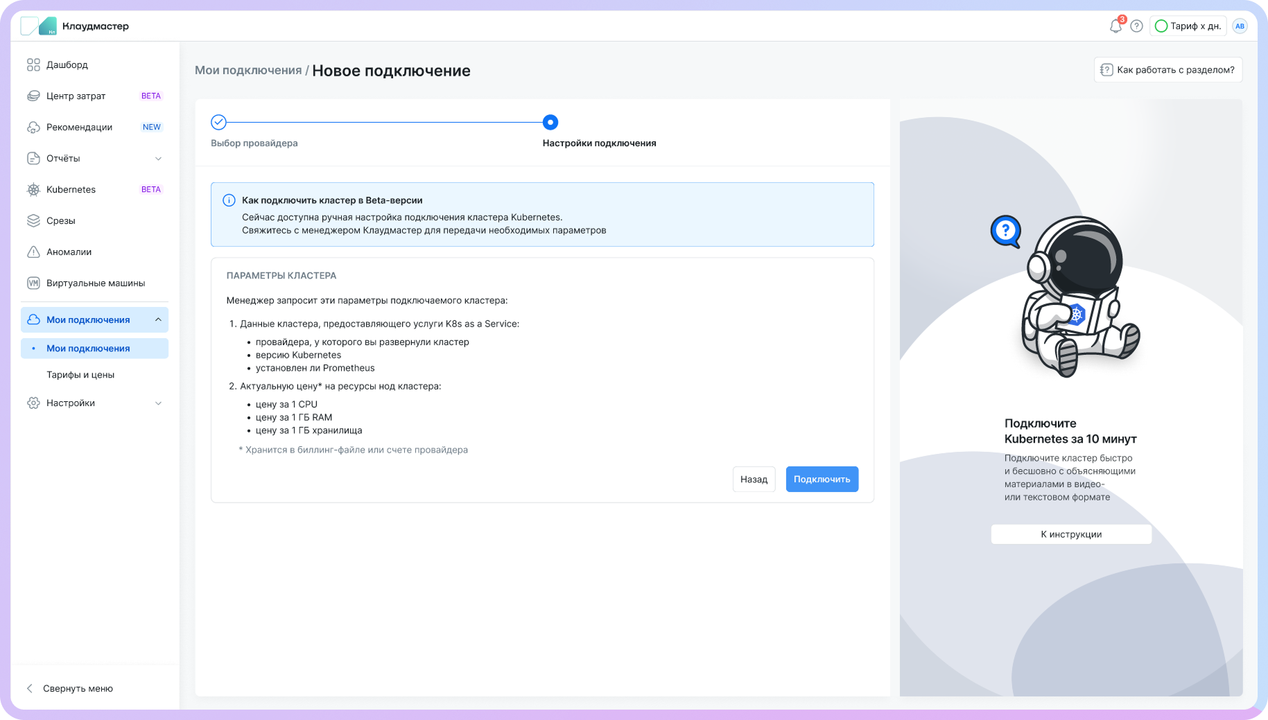 Мои подключения: добавили подключение кластера Kubernetes к Cloudmaster.