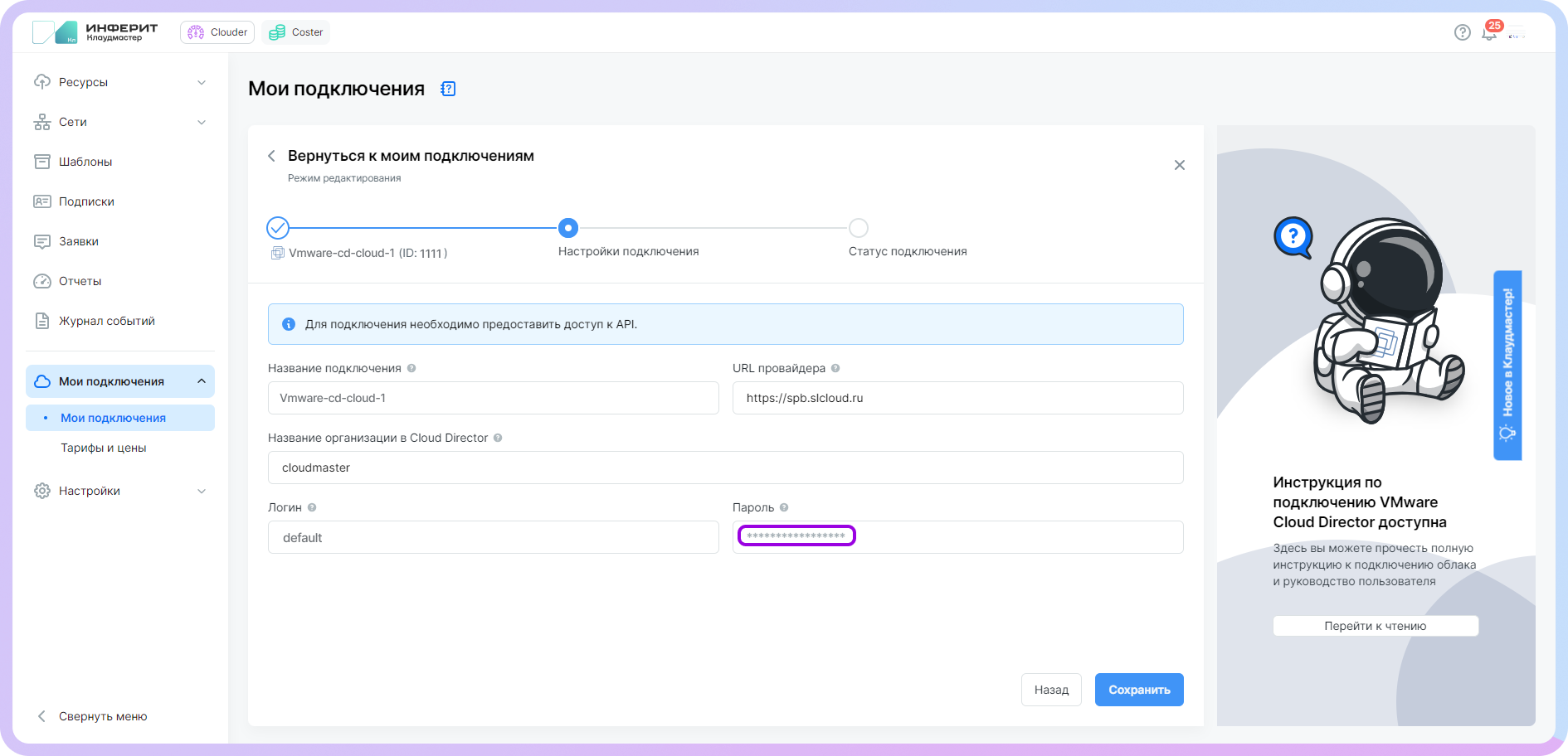 📖 Подробнее о создании подключения VMware Cloud Director.