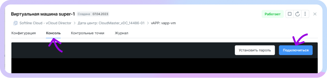 Настроили подключение к консоли без сетевой связности. Теперь к консоли ВМ можно подключиться через Cloudmaster (вкладка Консоль в карточке ВМ) без дополнительных настроек, что делает удобным управление ВМ, не выходя из интерфейса Cloudmaster.