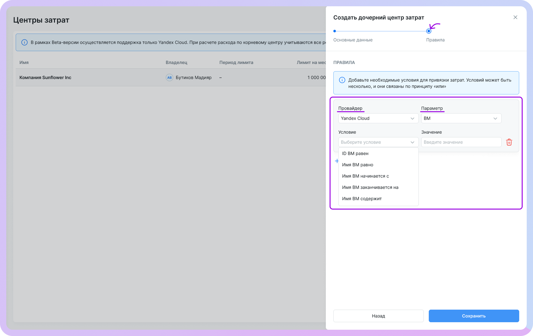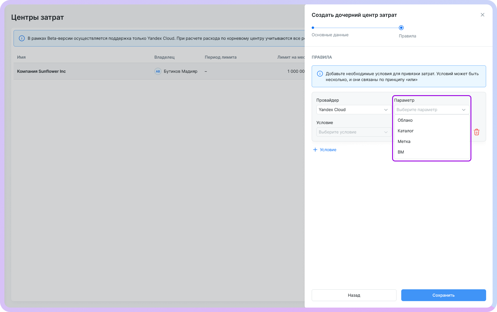 Центры затрат: добавили дополнительные поля Провайдер и Параметр в форму создания правил попадания объектов в дочерние центры затрат.
