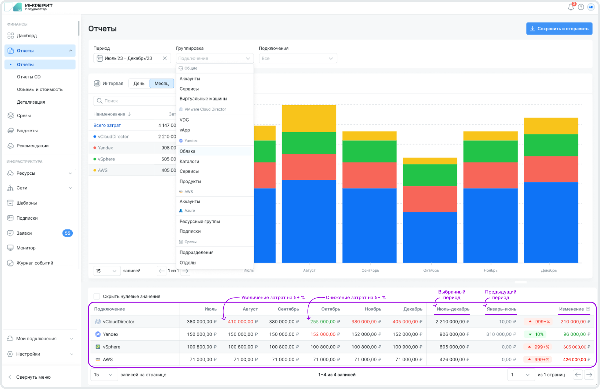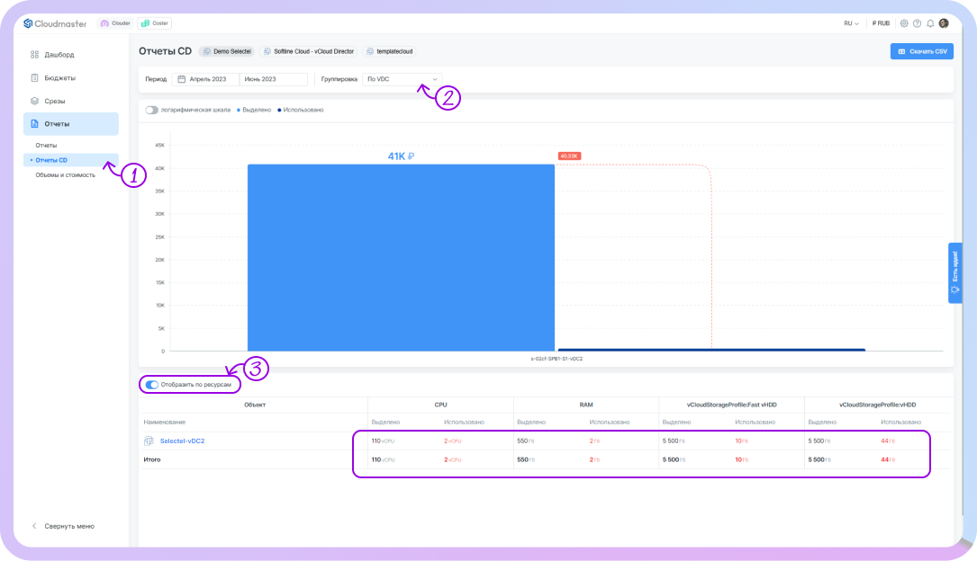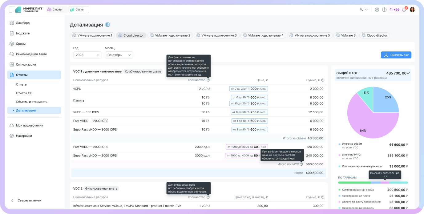 В раздел Отчеты добавили новый Отчет CD (Отчет VMware Cloud Director) по VDC, который показывает сравнение между стоимостью за выделенные и использованные ресурсы (что позволит пользователям оптимизировать потребление и платить меньше).