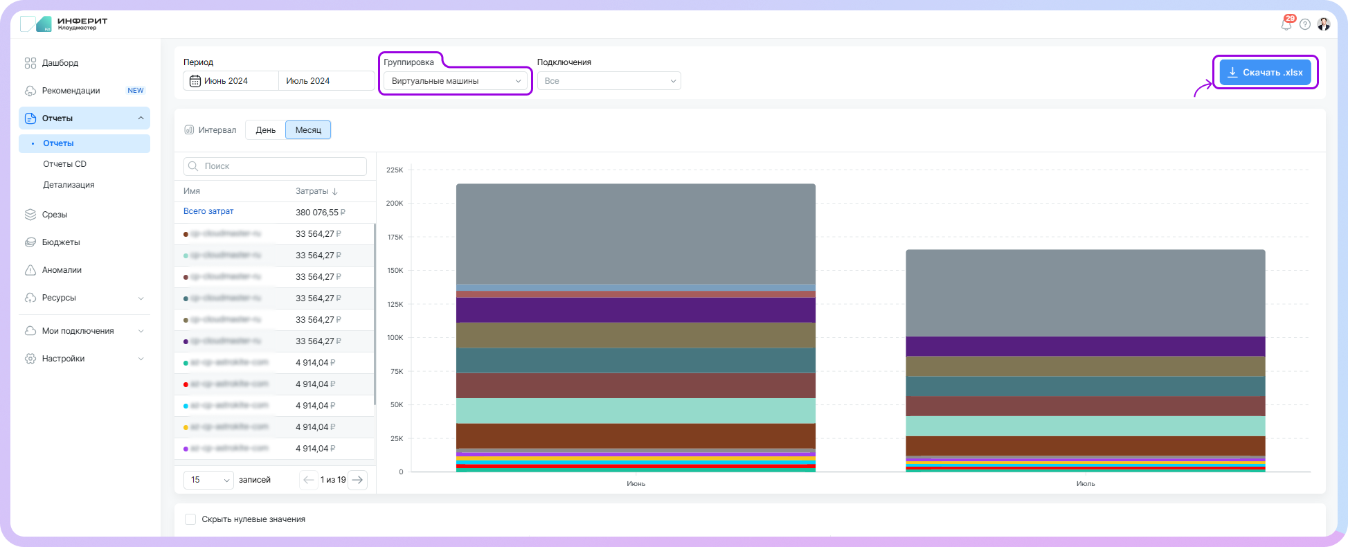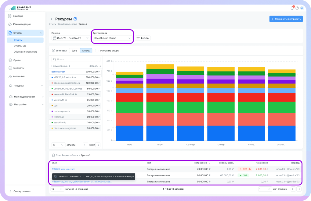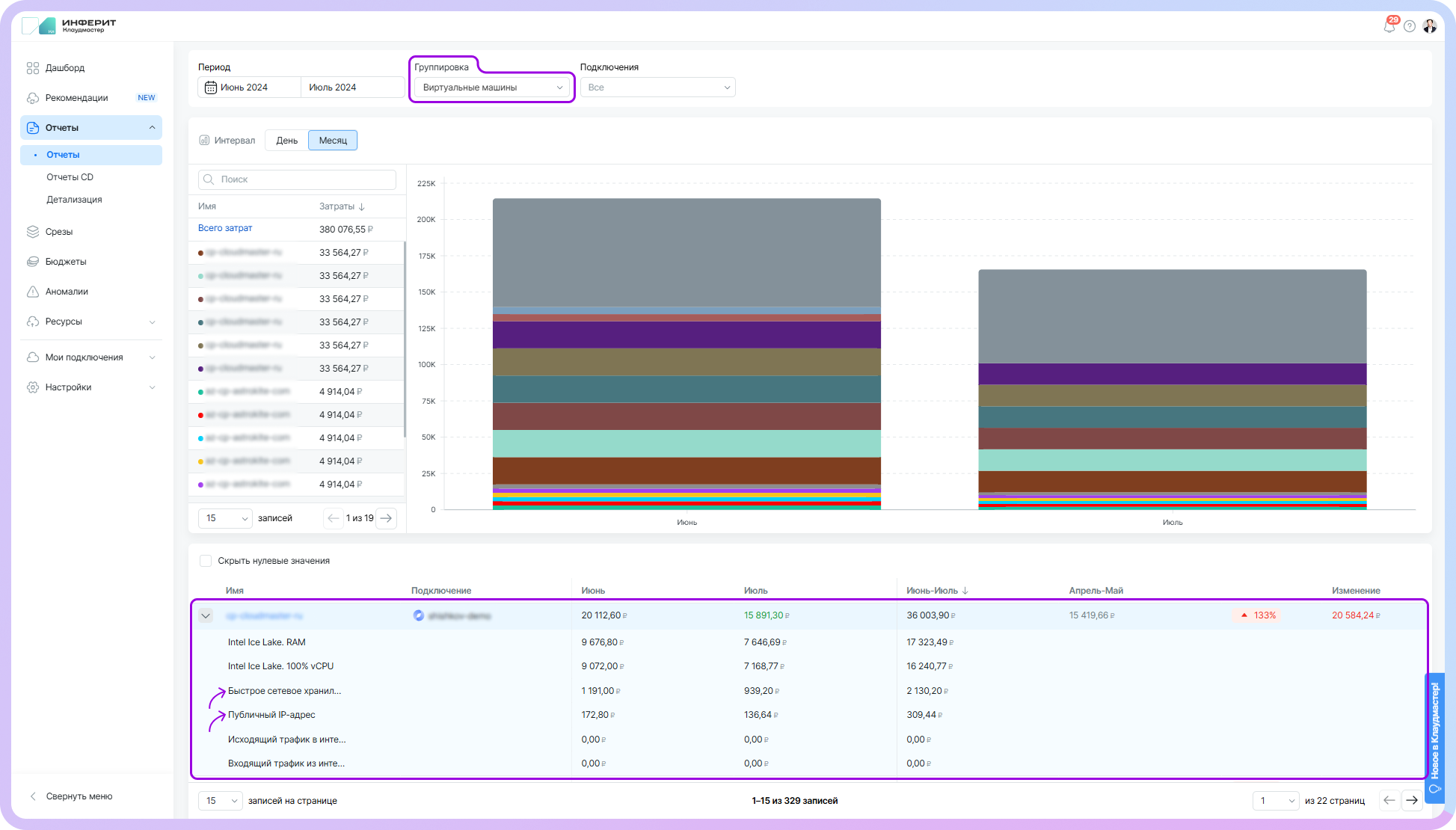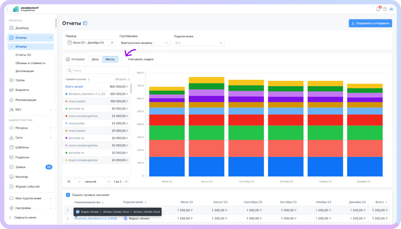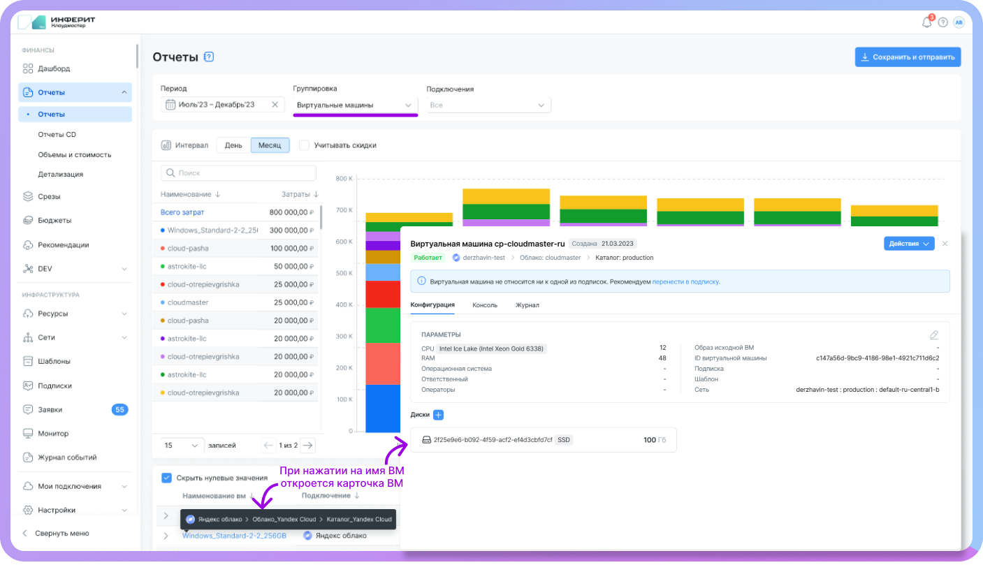 В разбивке затрат по ВМ учитываются: CPU, RAM, диски, трафик, канал связи и IP-адреса.