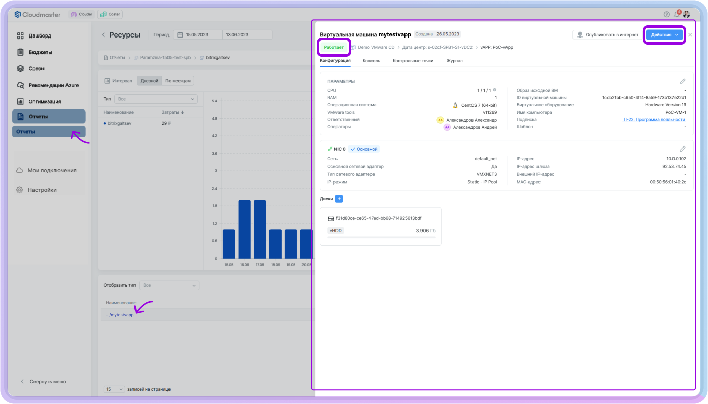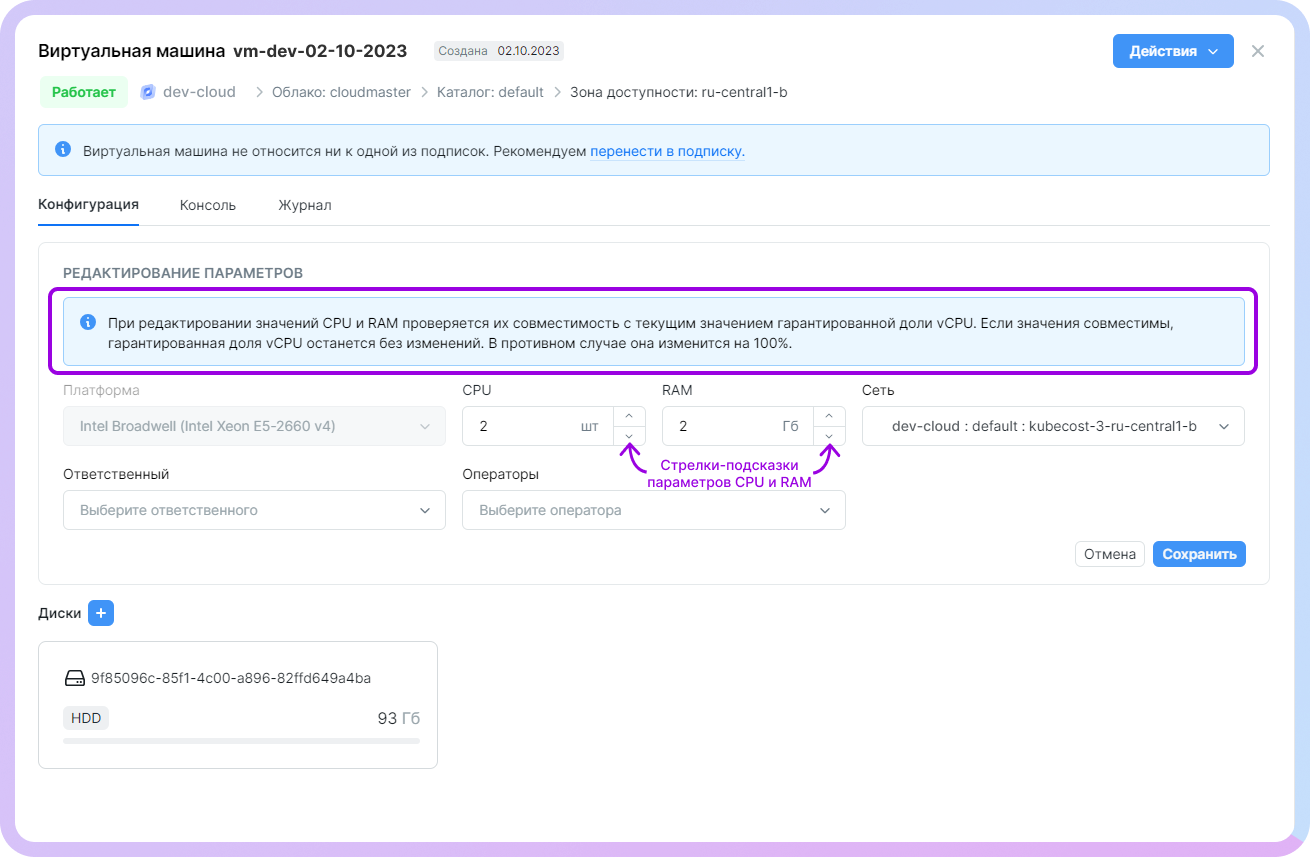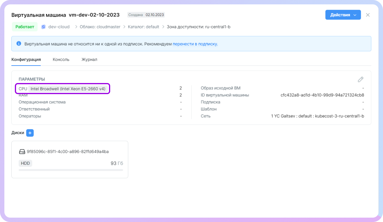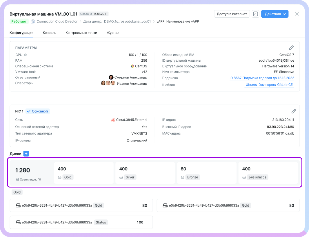 Вкладка Конфигурация: а) CPU, RAM, диски, б) открепленные диски, в) Ответственный за ВМ, г) Подписка Clouder, д) теги, бейджи, е) цены на CPU, RAM, диски, ж) состояние ВМ (удалена, вкл, выкл).