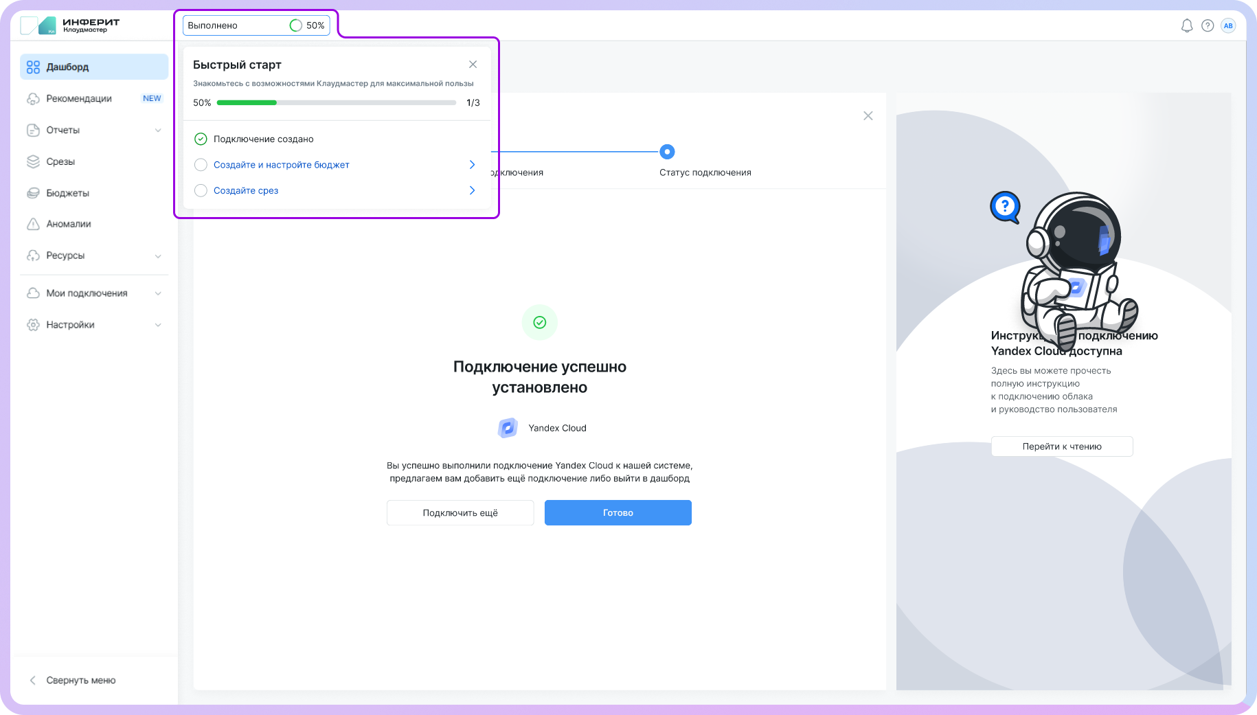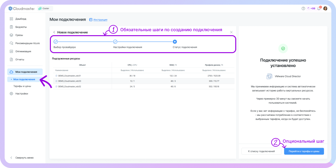 - при создании нового подключения Cloudmaster автоматически подгружает в карточку подключения значения Выделено и Использовано по ресурсам;