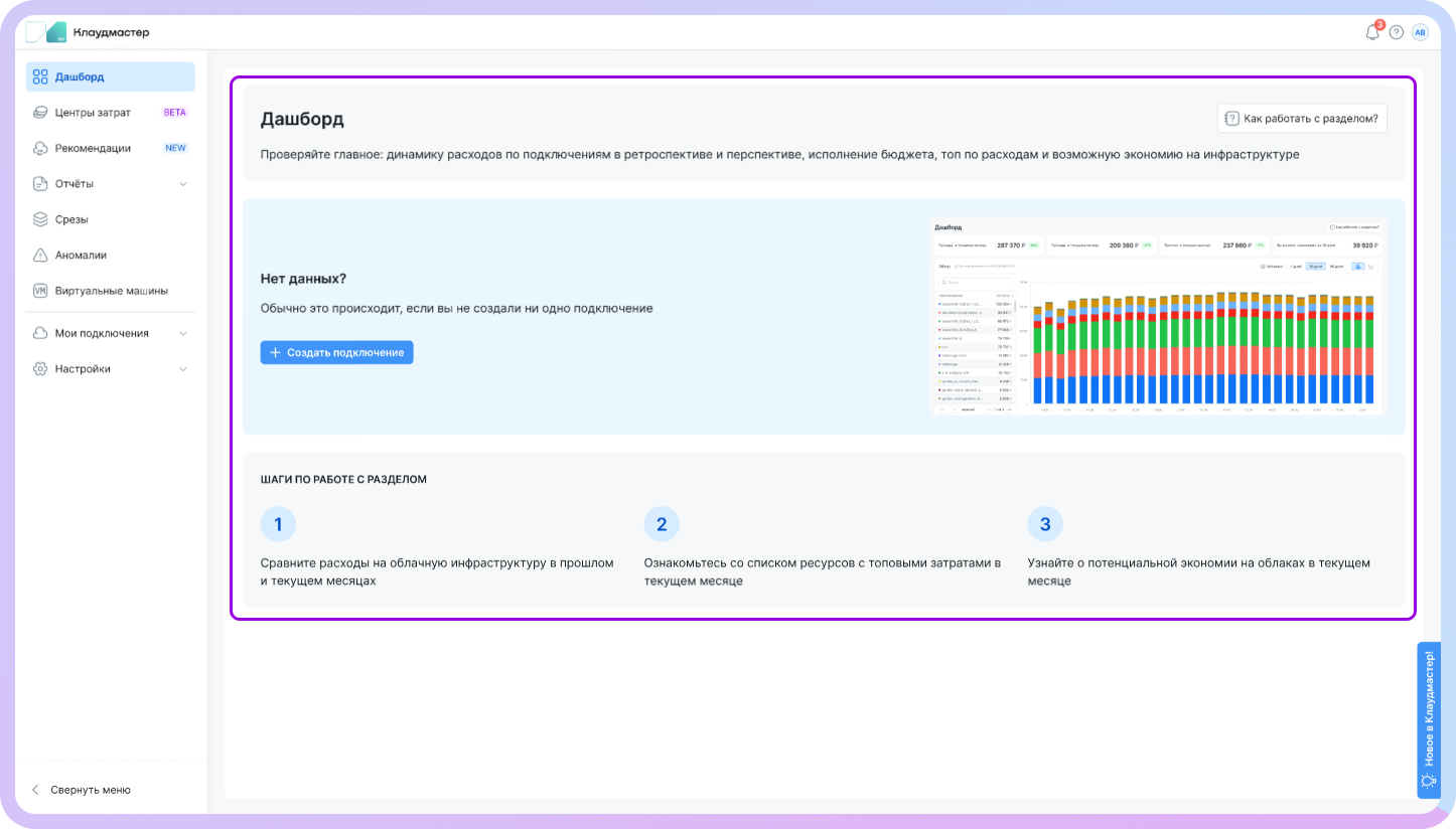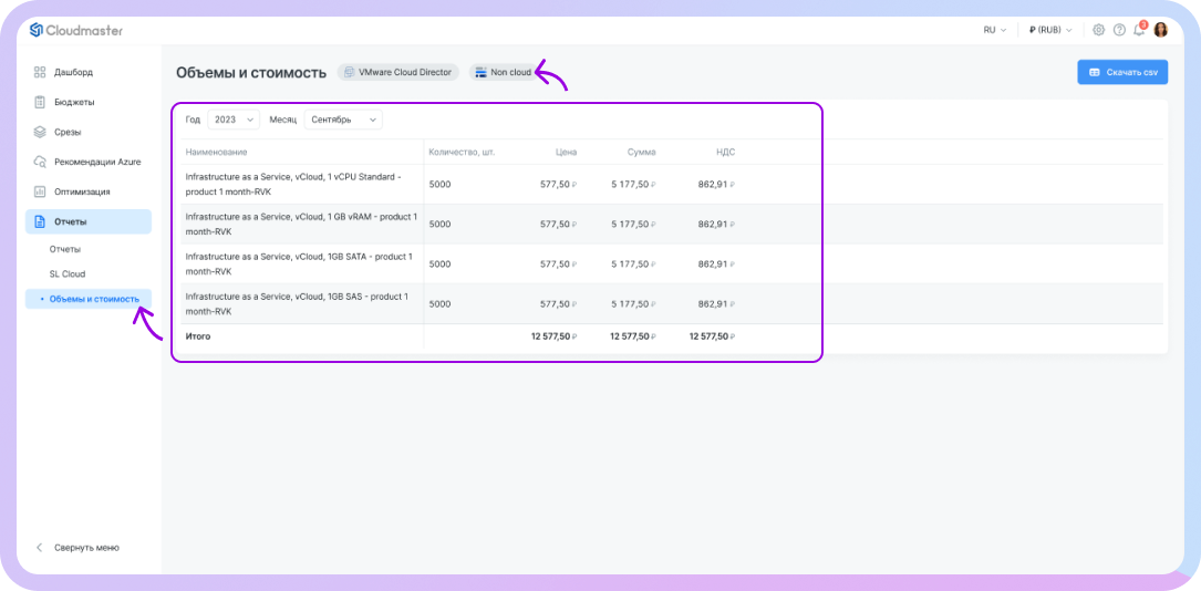 В отчете Объемы и стоимость появилась новая вкладка (чипса) Non cloud с фиксированными позициями счета пользователя. Пользователю рекомендуется заполнять ее сразу после создания подключения.