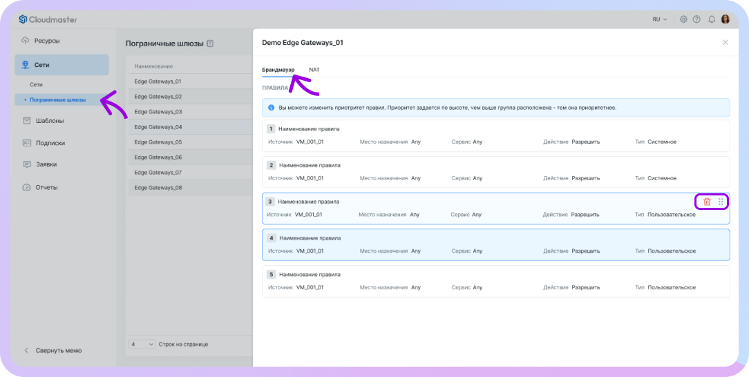 Раздел Пограничные шлюзы: добавили редактирование приоритета и удаление правил Firewall Глобальным администратором для обеспечения порядка в списке и безопасности инфраструктуры.