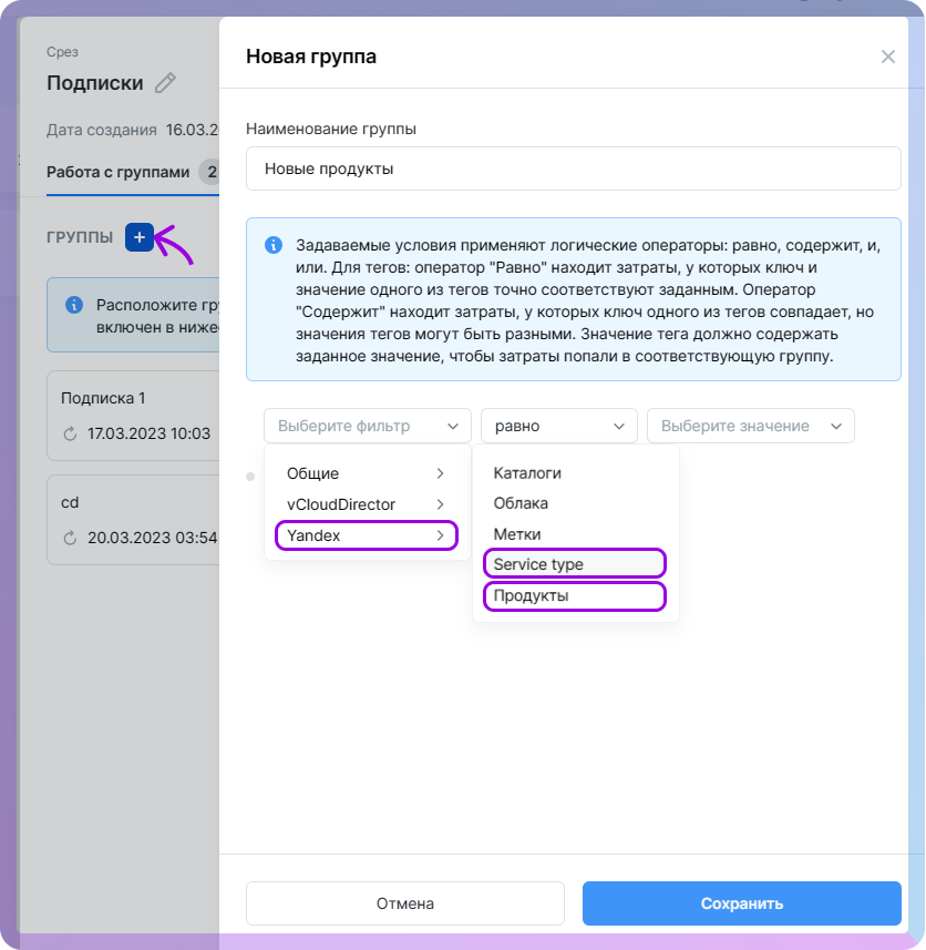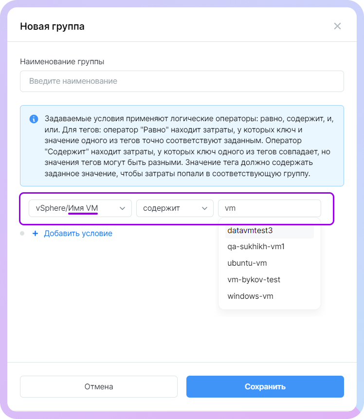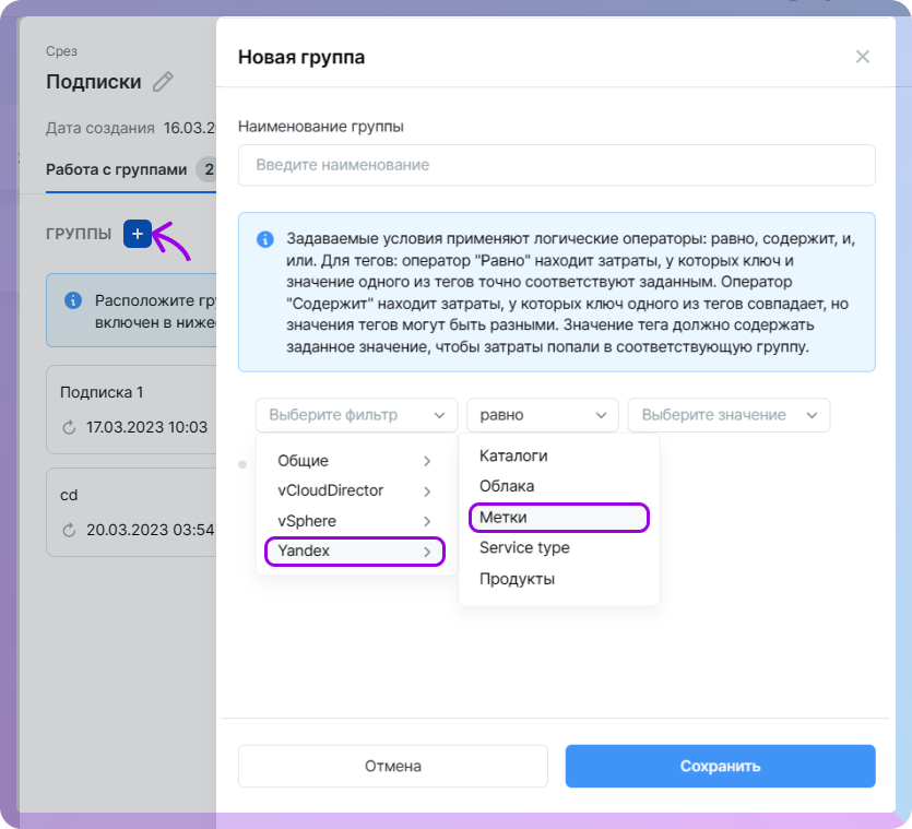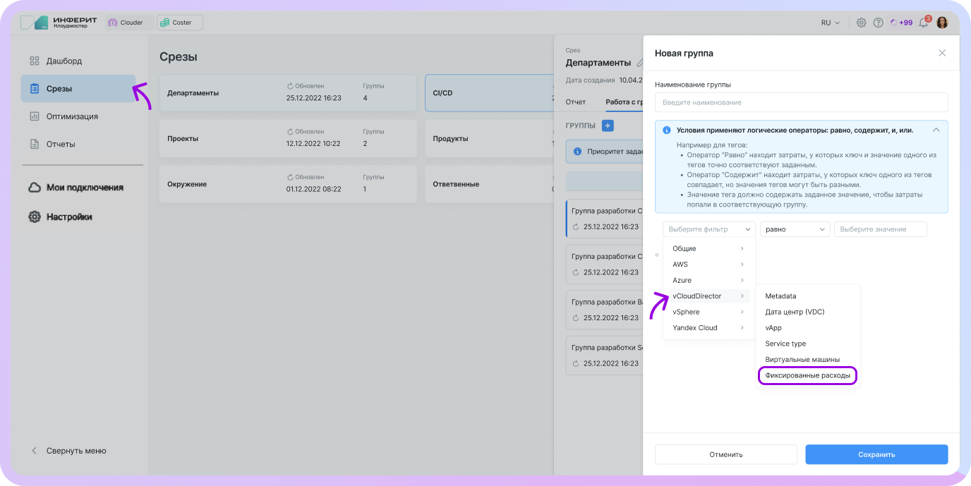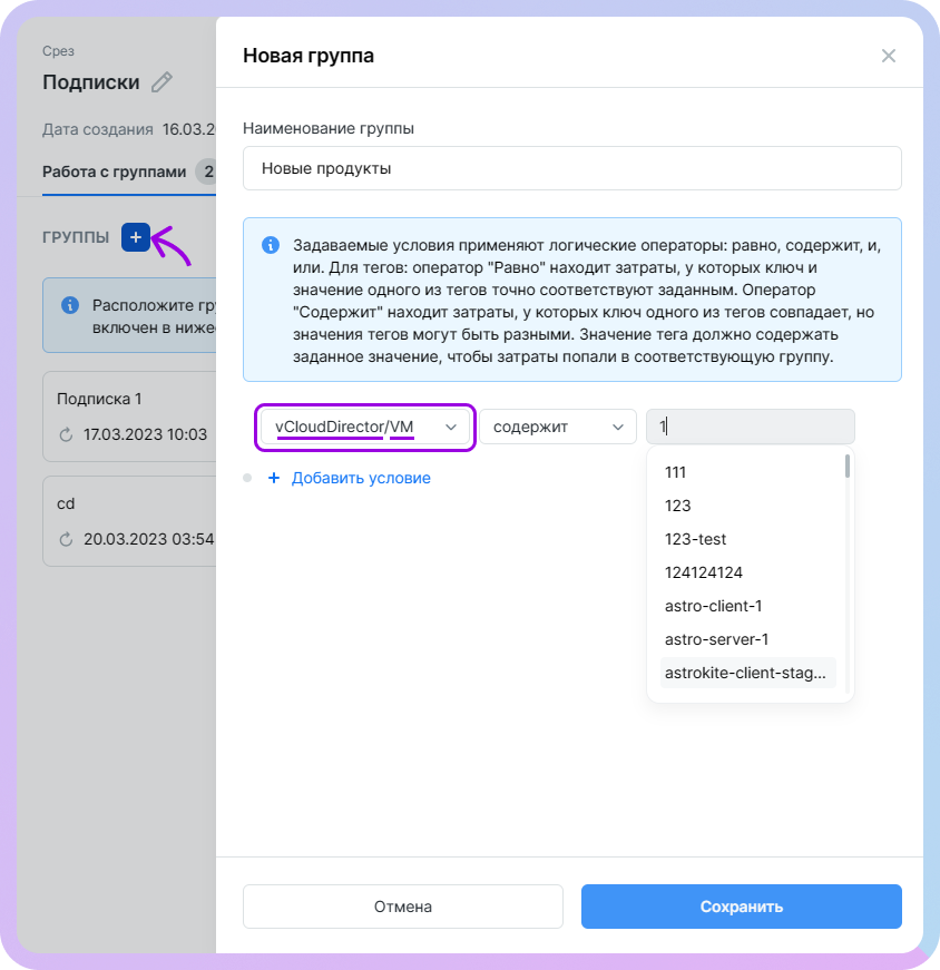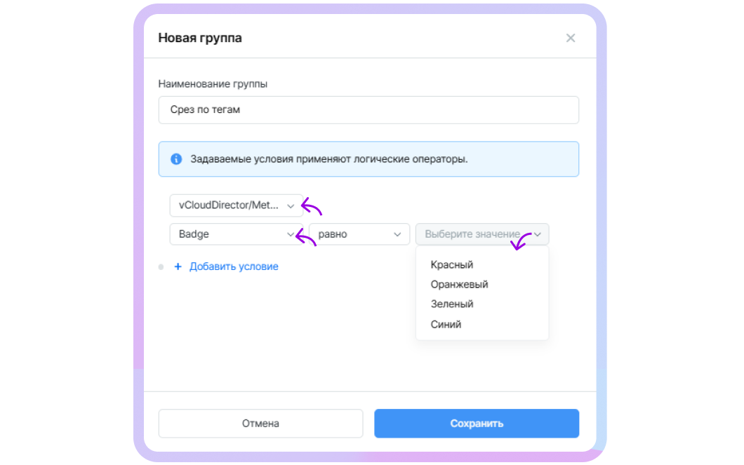 В Срезы добавили новые условия для подключений VMware Cloud Director "Metadata": теги и бейджи.
