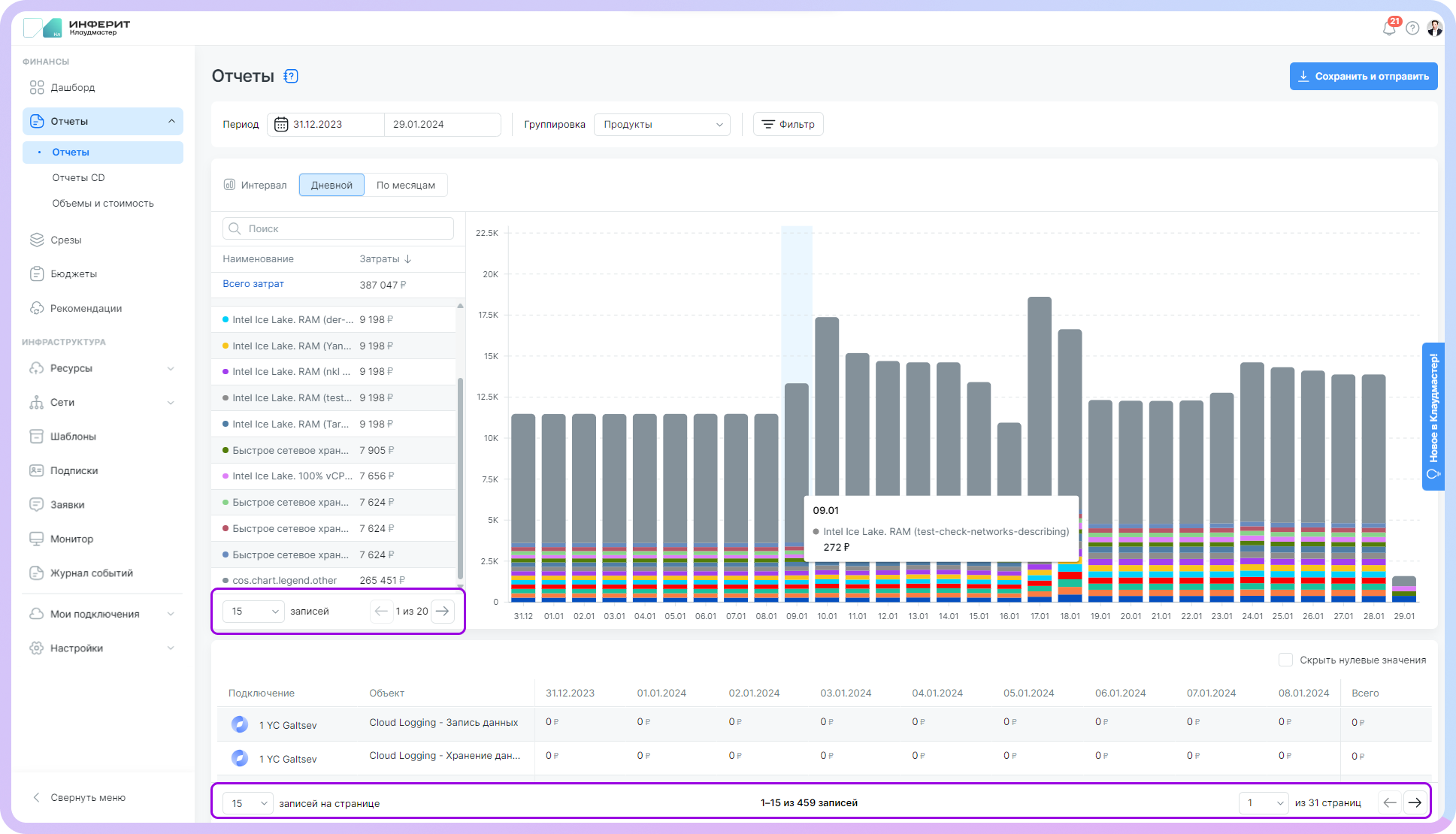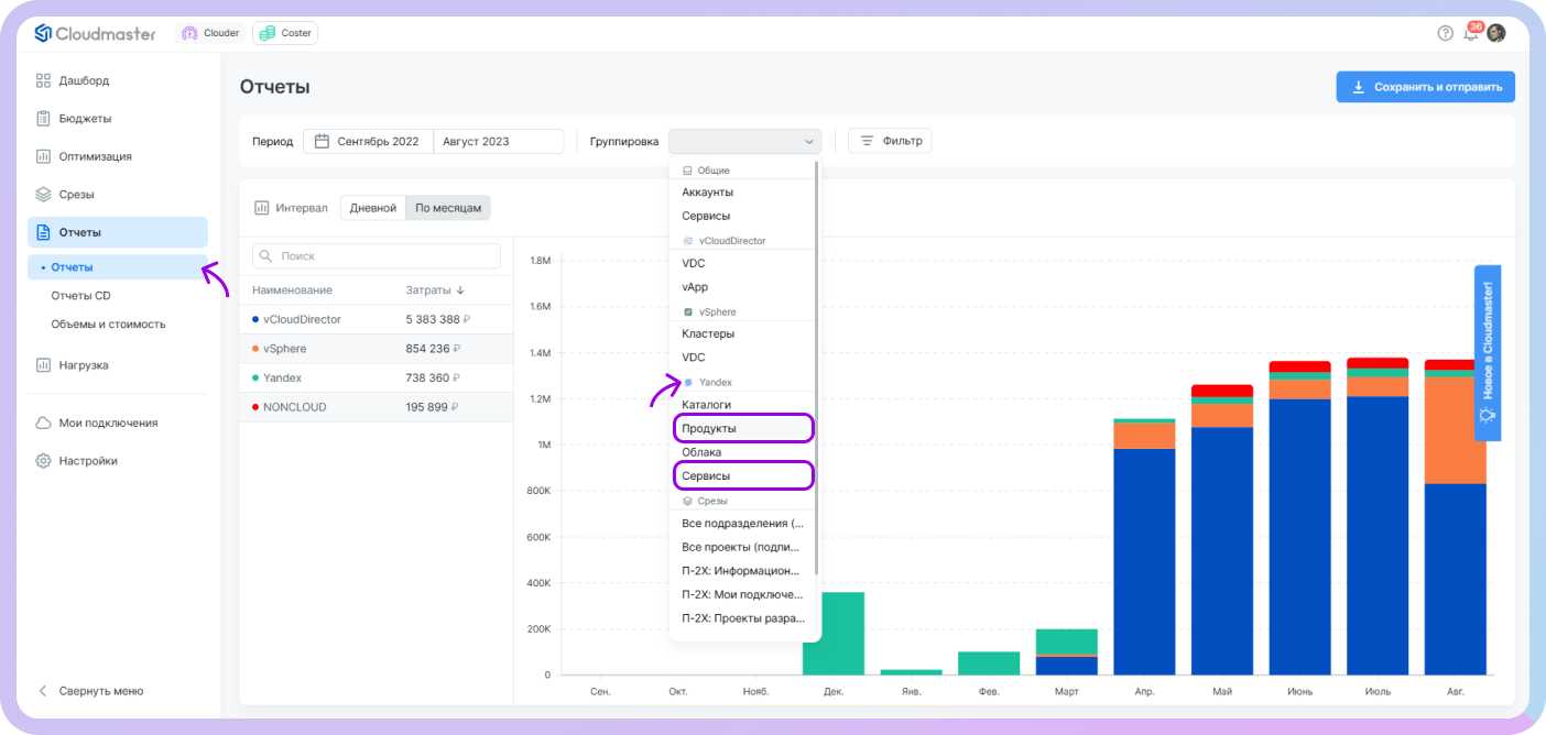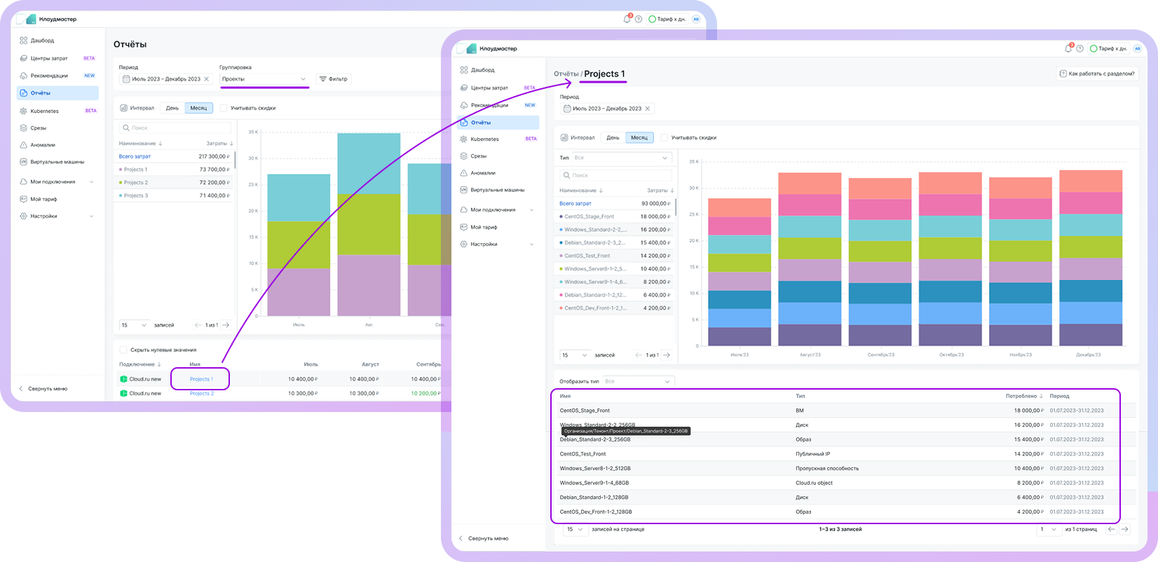 Отчёты: представили отчёты по подключению Cloud.ru Advanced и добавили группировку по проектам.