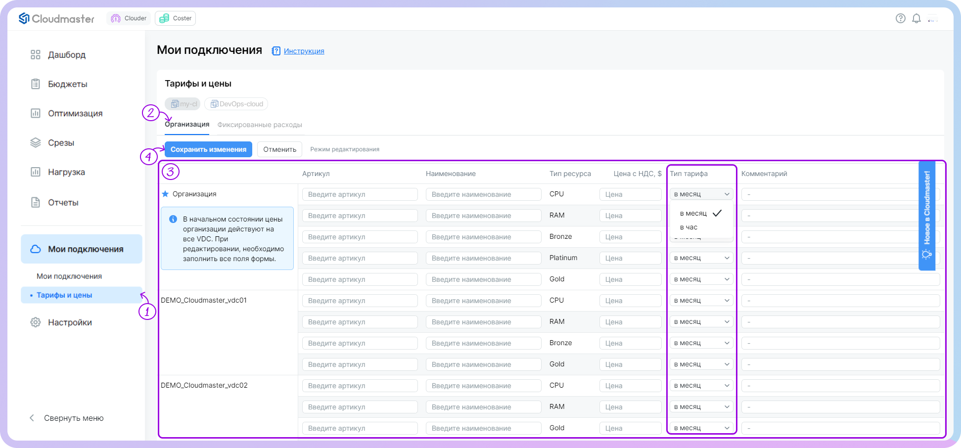 - задать период тарифа в поле Тип тарифа: в час или в месяц (месяц задан по умолчанию);