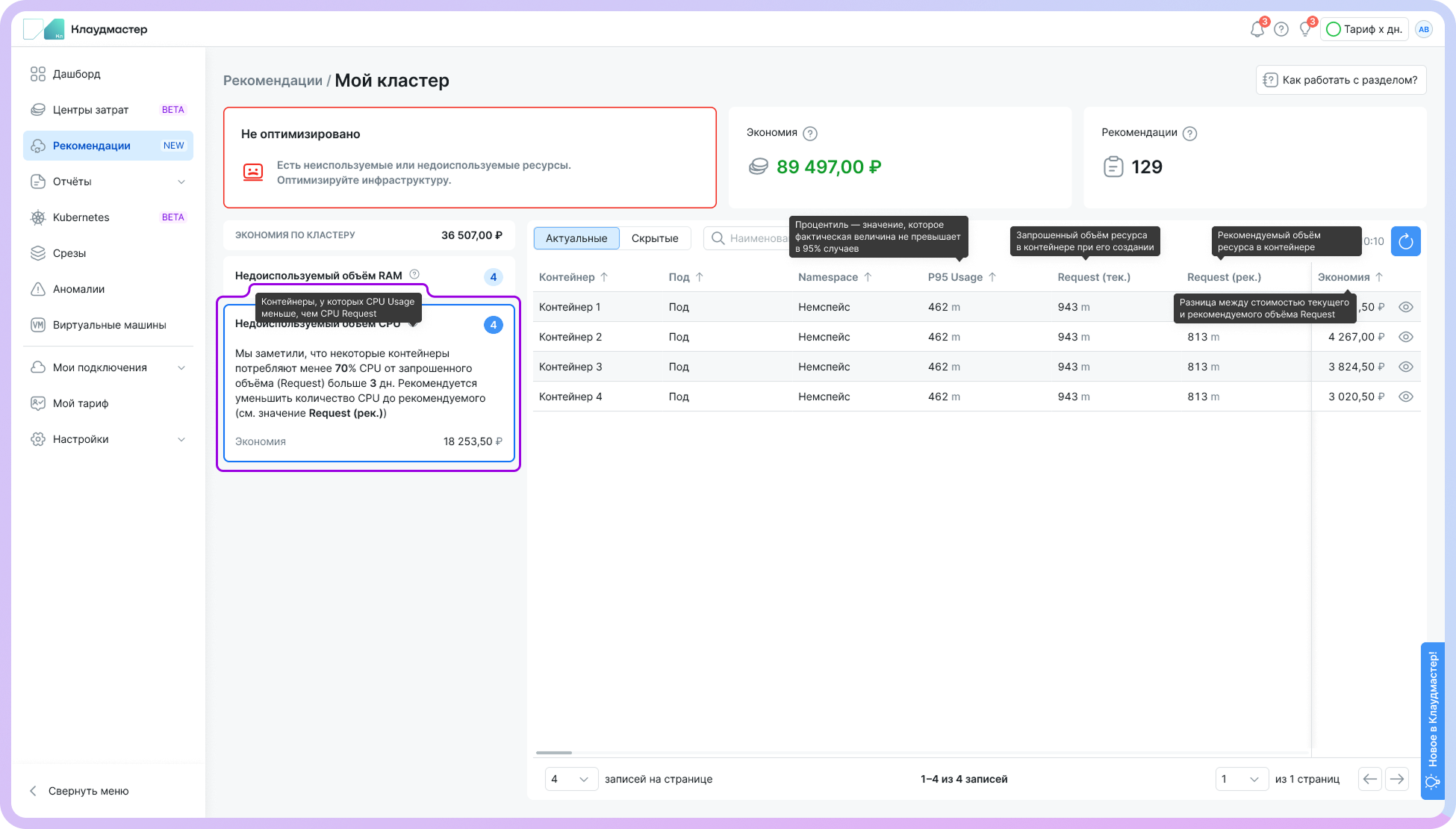 Рекомендации: добавили рекомендацию по недоиспользуемому объёму CPU в контейнерах Kubernetes.