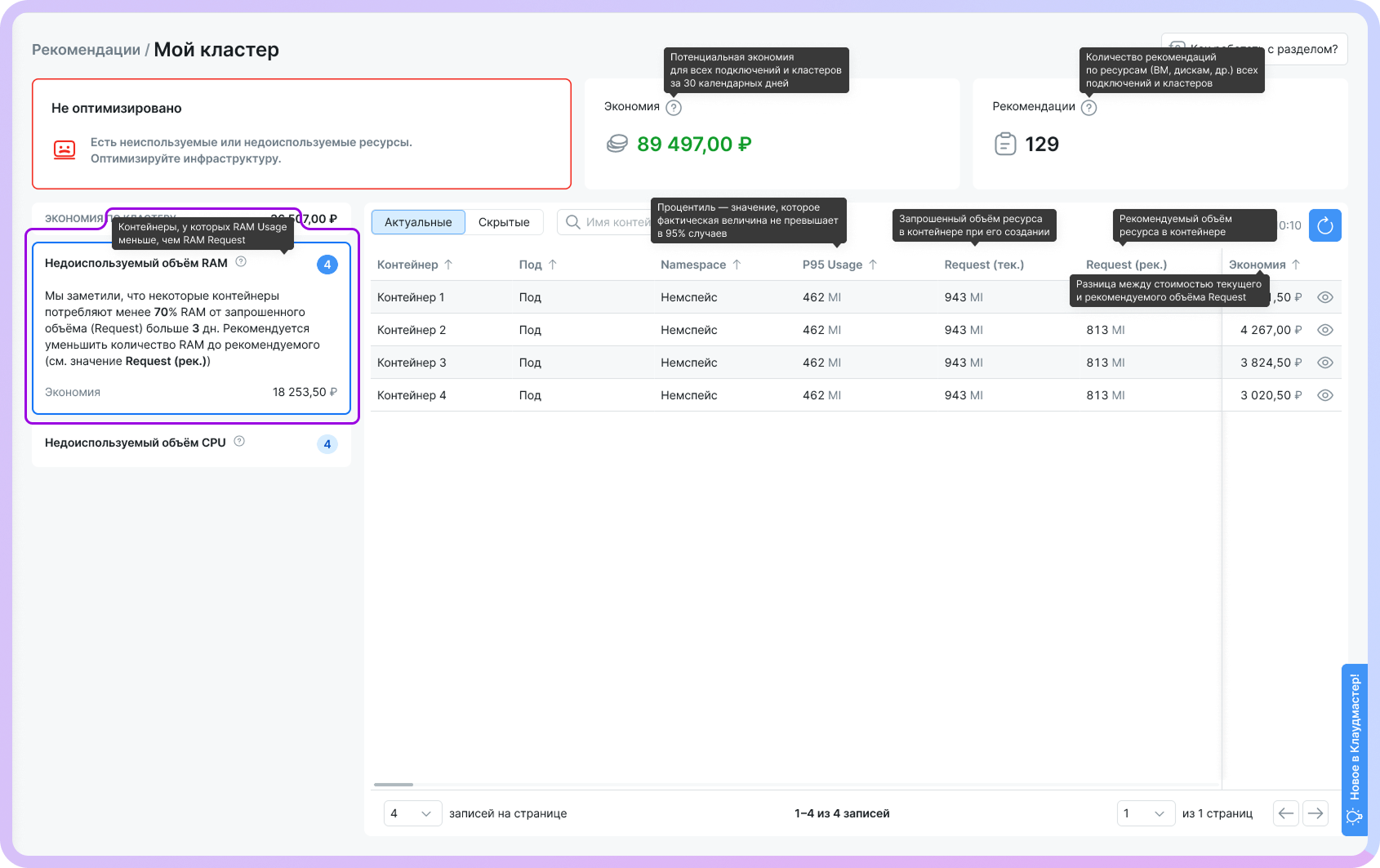 Рекомендации: добавили рекомендацию по недоиспользуемому объёму RAM в контейнерах Kubernetes.