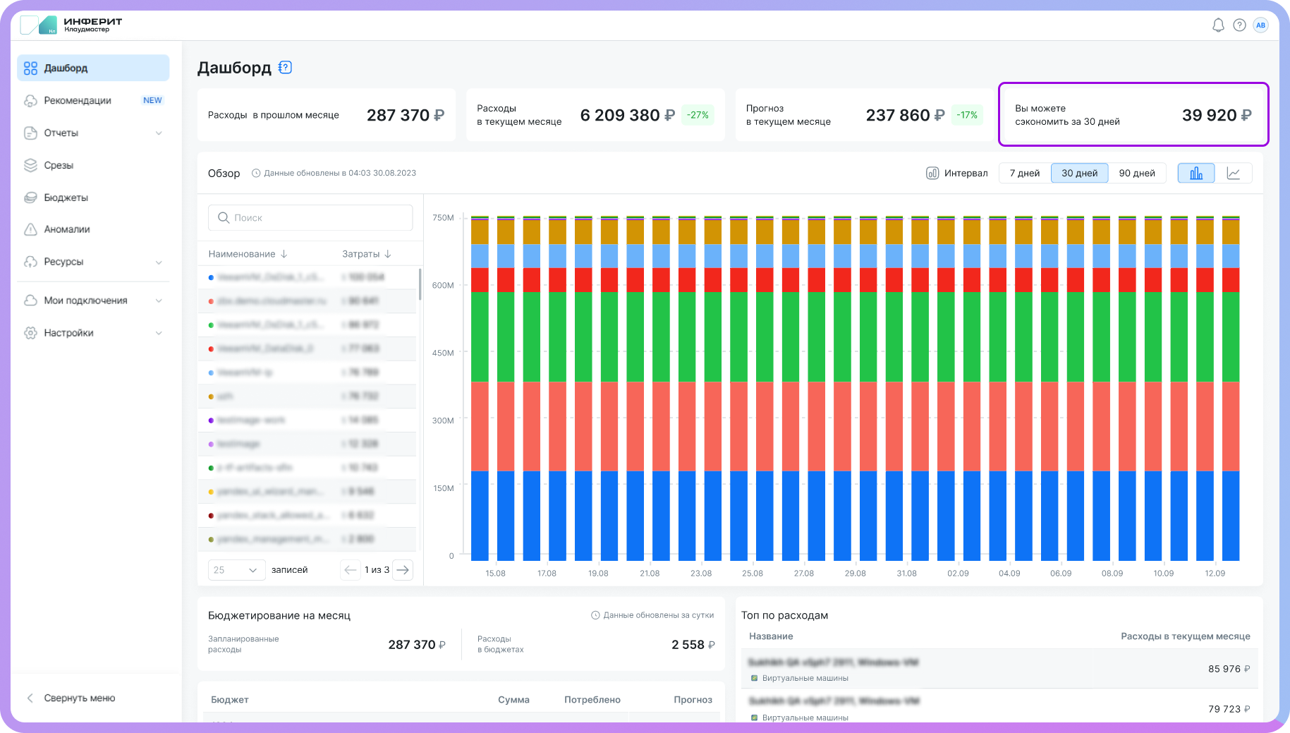 Вкладка Расходы: график и таблица затрат по типам ресурсов.