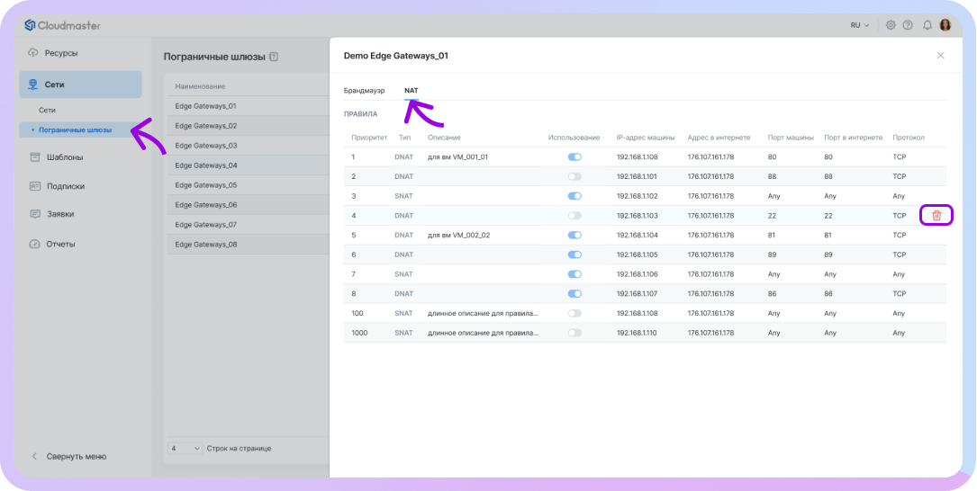 Раздел Пограничные шлюзы: добавили удаление ГА пользовательских правил NAT для поддержания актуальности списка.