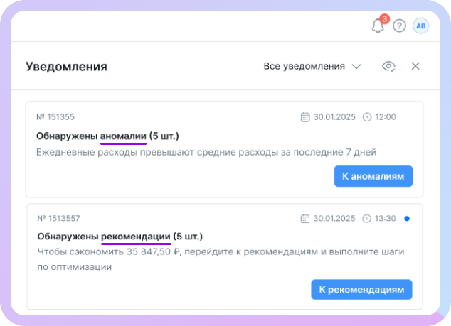 Пользователи смогут передавать данные в удобном формате ЛПР (финансовому директору, бухгалтеру и др.) и рассчитывать экономию после исключения аномалий.