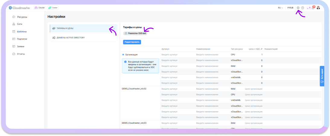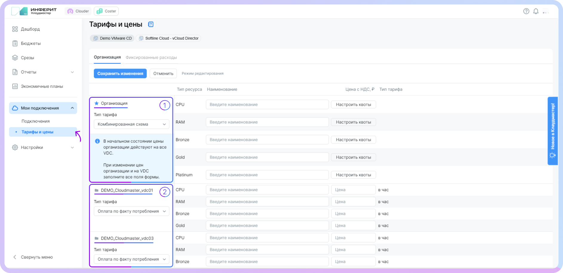 Теперь пользователь сможет задавать тарифы организации и указывать их по VDC для удобства работы с отчетами Coster (страницы Отчет CD и Объемы и стоимость).