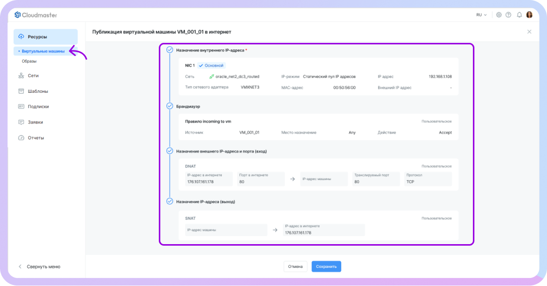 Запустили мастер настройки по выводу ВМ в Интернет, что обеспечивает ясность и пошаговость процедуры для клиента.