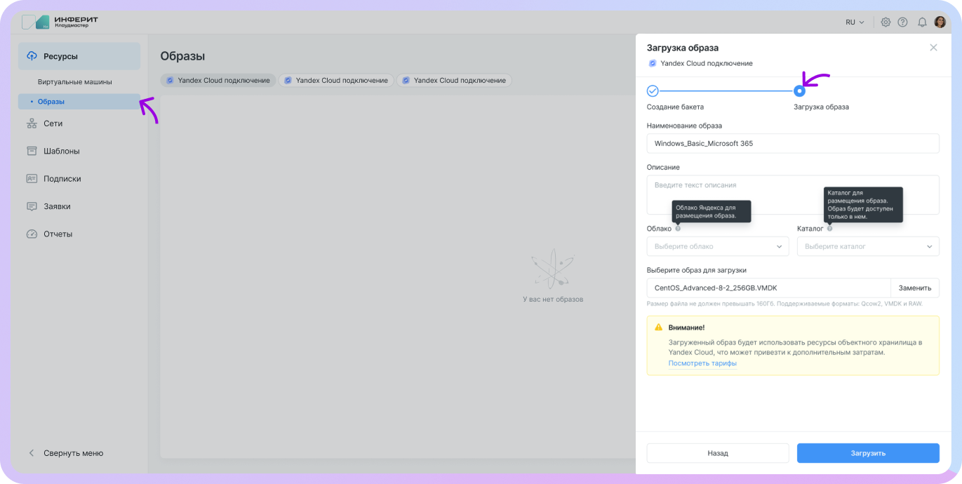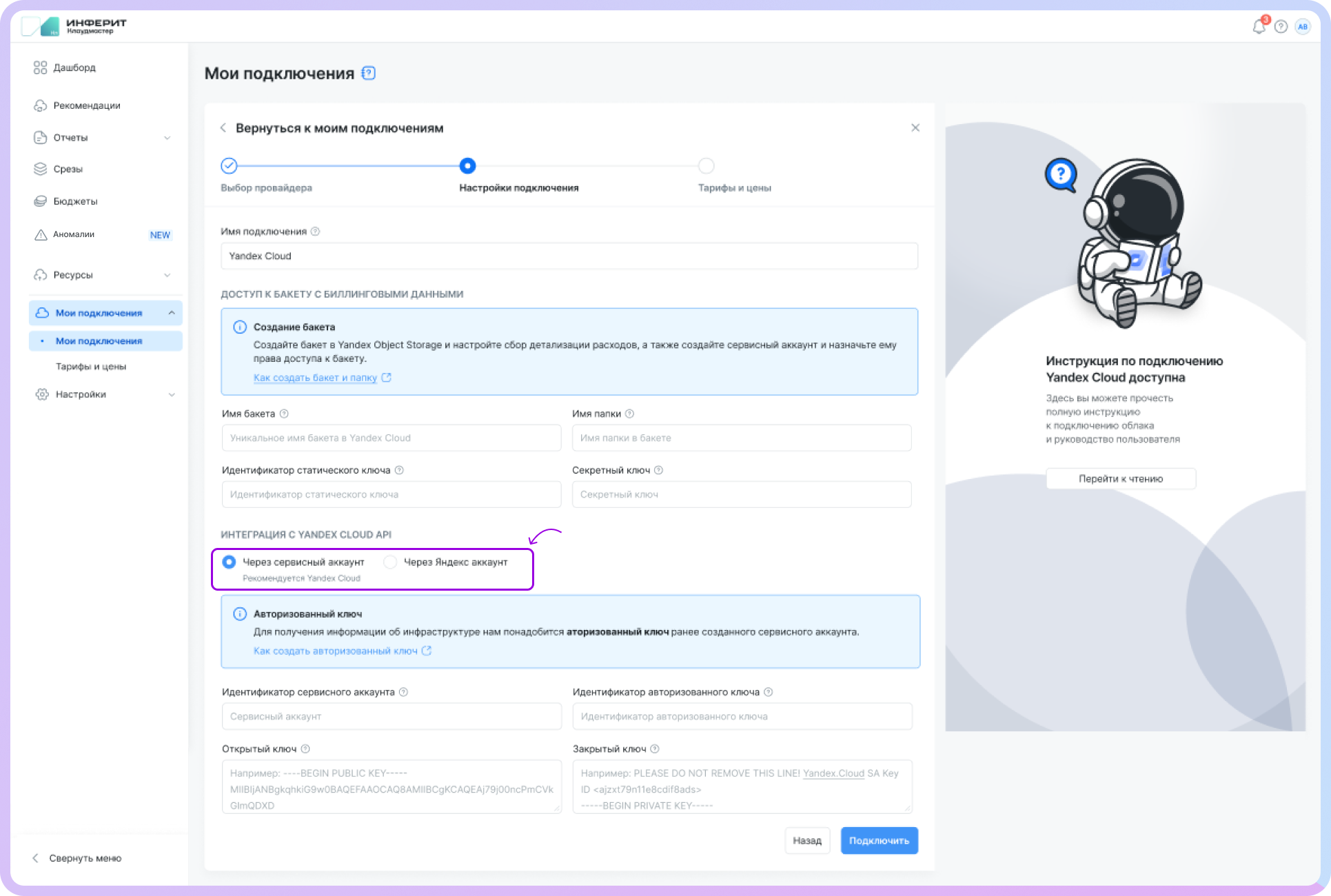 • Облако, Каталог и Метку для подключений Yandex Cloud,