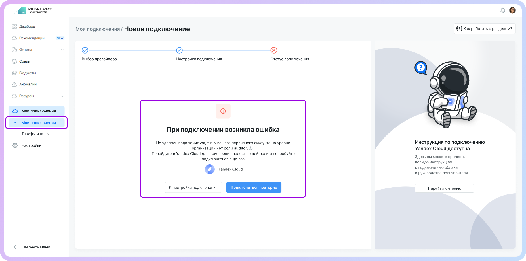 Добавили причины, по которым подключение Yandex Cloud заканчивается ошибкой.
