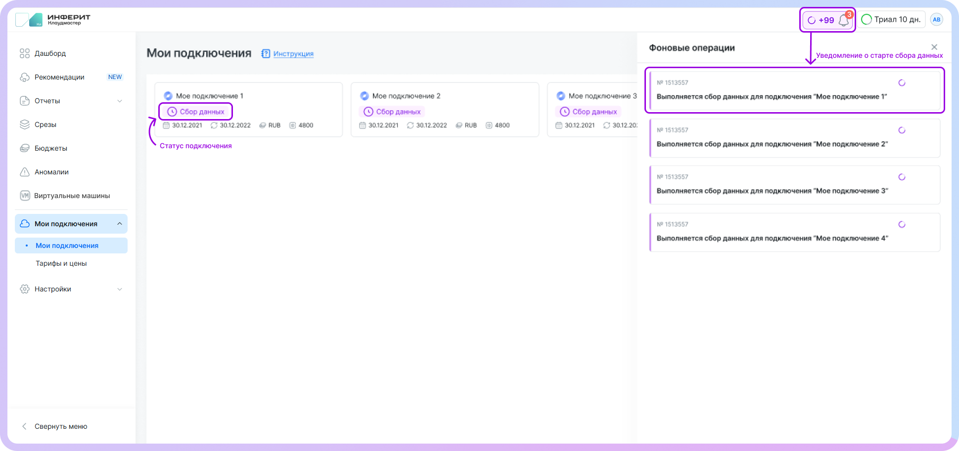 Боковая панель: перенесли Тарифы и цены в раздел Мои подключения (☁️).