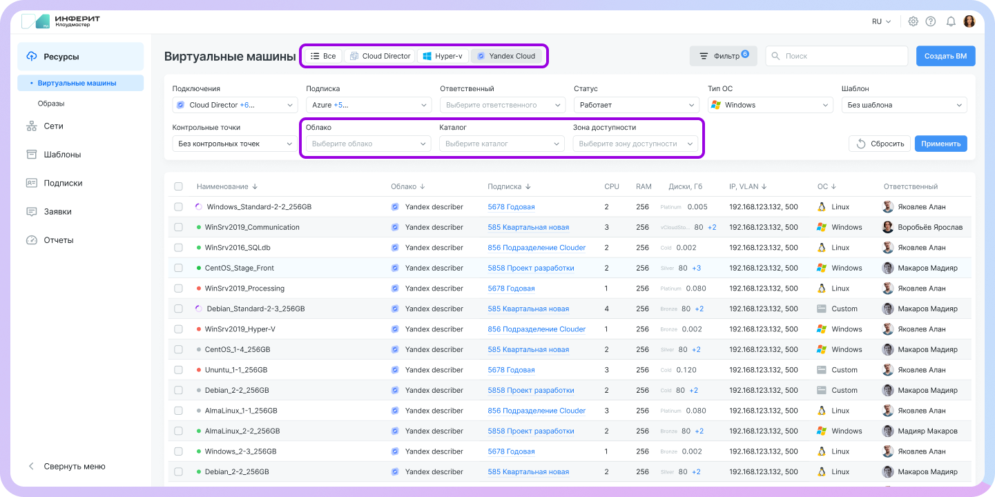 Изменилась последовательность разделов в боковой панели: Ресурсы, Сети, Шаблоны, Подписки, Заявки и Отчеты.